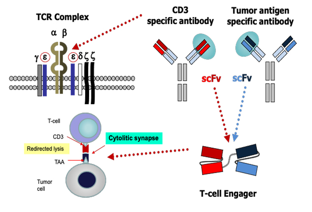 BiTE,全称是Bispecific T cell Engager,双特异性T细胞结合器,也称为双特异性抗体。BiTE的组成是将某种肿瘤抗原的抗体识别区序列(anti-TAA scFv)与CD3ε链单克隆抗体的抗原识别区(anti-CD3 scFv)在通过接头肽(Linker)串联而成,在T细胞和肿瘤之间起“桥梁”作用,介导 T细胞靶向识别并特异性杀伤肿瘤细胞。该杀伤作用起效快,效果显著。